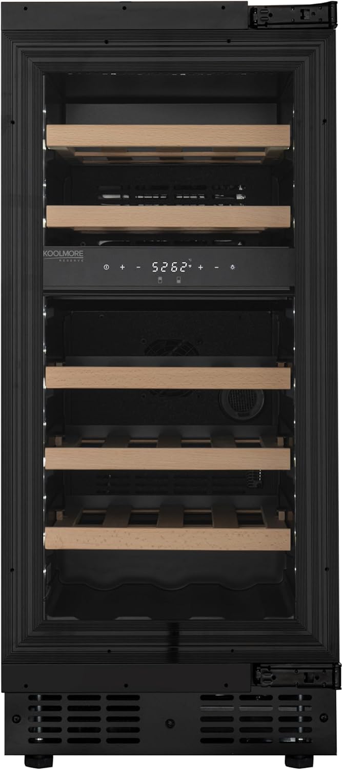 KoolMore Reserve Collection: Proudly part of the high-end collection, this KoolMore Dual Zone Wine Cooler exemplifies luxury, style, and superior craftsmanship, making it a standout choice for sophisticated wine storage solutions. Panel Ready Design: Seamlessly integrate the cooler into your kitchen cabinetry with the panel-ready feature. Achieve a sleek, built-in look that complements your interior design aesthetic. Silent Mode for Enhanced Comfort: Enjoy quiet operation with the option to activate Silent Mode. Ideal for spaces where noise levels are a concern, Silent Mode ensures minimal disturbance without compromising on performance. High-Grade Wooden Shelves: Crafted from high-quality Beech Wood, the shelves provide a luxurious aesthetic and contribute to the ideal wine aging and storage environment. Dual-Zone Technology: Maintain optimal storage conditions for both red and white wines simultaneously with two distinct temperature zones.